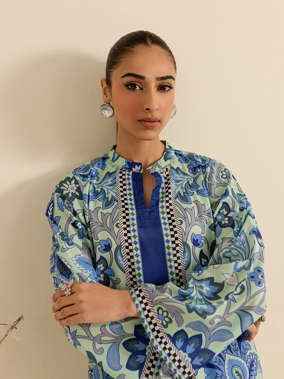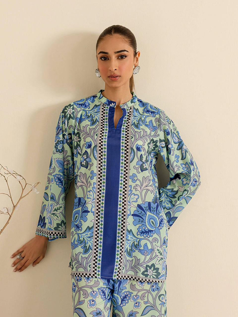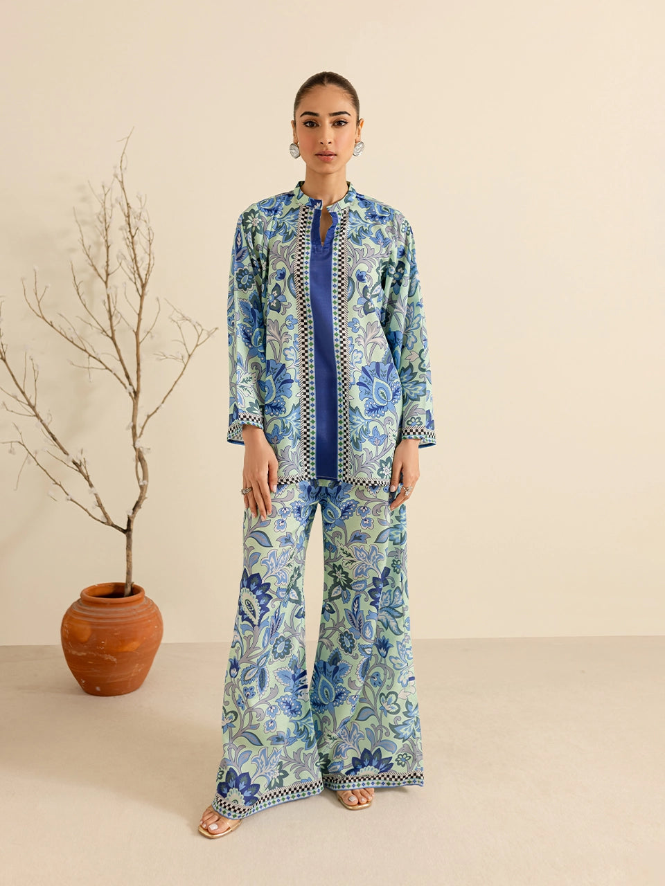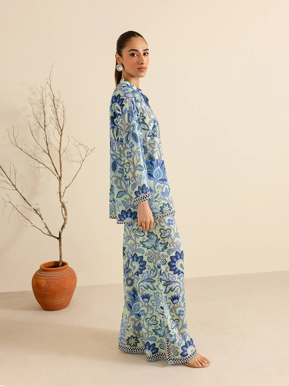 Description: This coord set features a mesmerizing blue floral pattern that exudes sophistication and charm. The intricate design is complemented by the relaxed silhouette, making it perfect for both casual outings and semi-formal occasions. Its lightweight fabric ensures all-day comfort while maintaining a refined look.