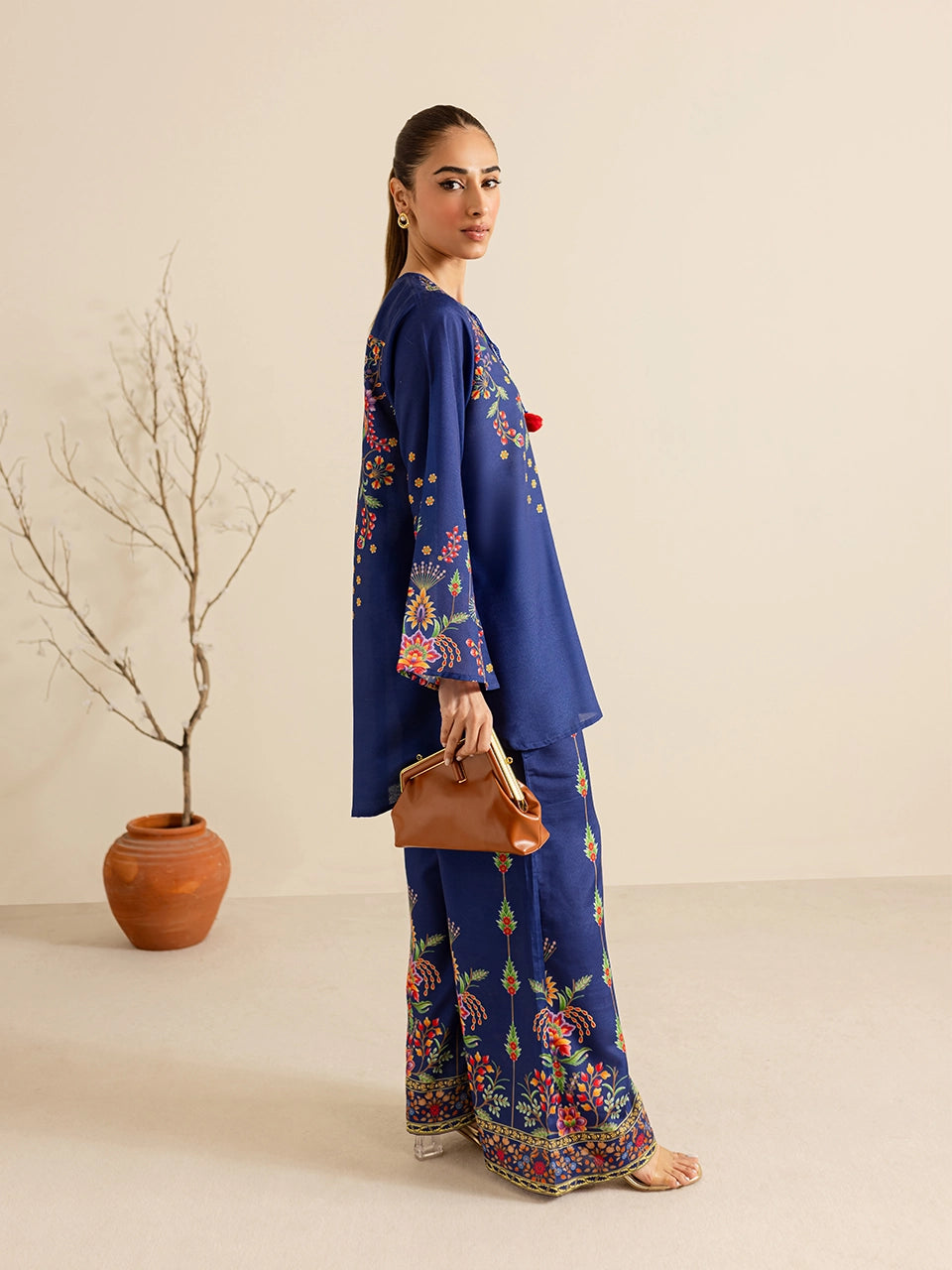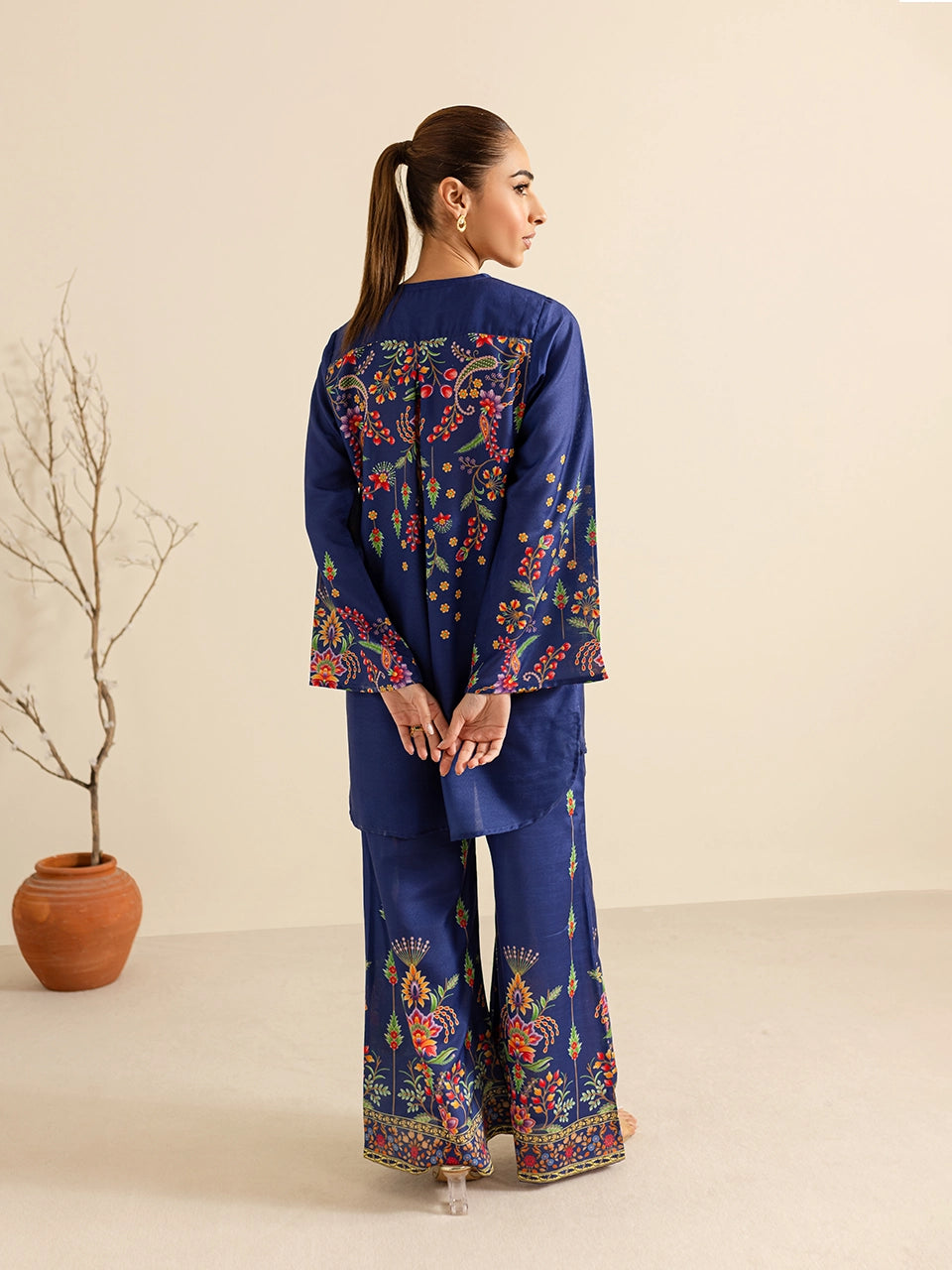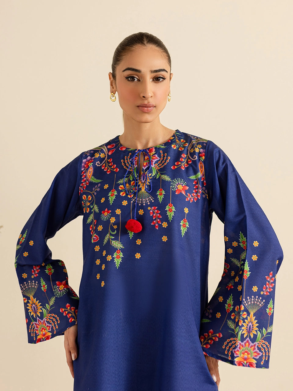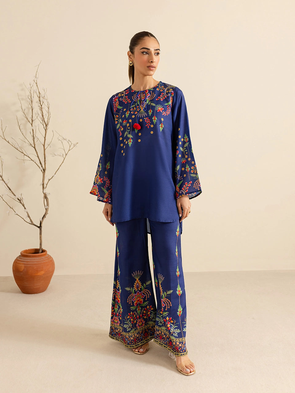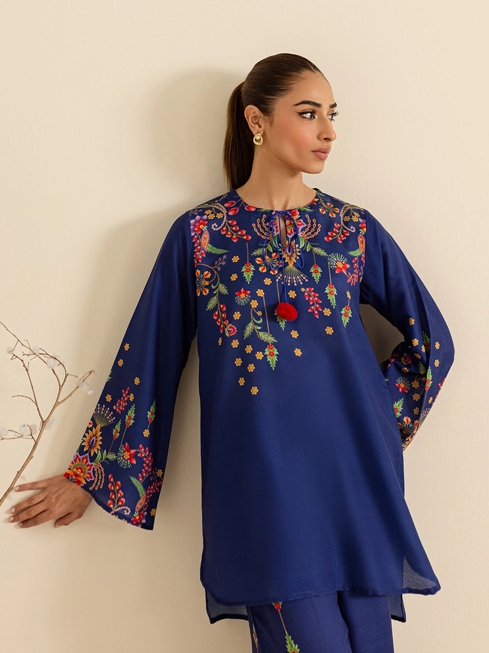 Description: This elegant royal blue ensemble showcases intricate floral print in vibrant hues of red, yellow, and green. The soft and breathable fabric is complemented by pom-pom tie details on the neckline, adding a playful touch to the traditional aesthetic. The accompanying pants, adorned with matching floral motifs and a bordered design, completes the set, making it a perfect choice for casual gatherings.