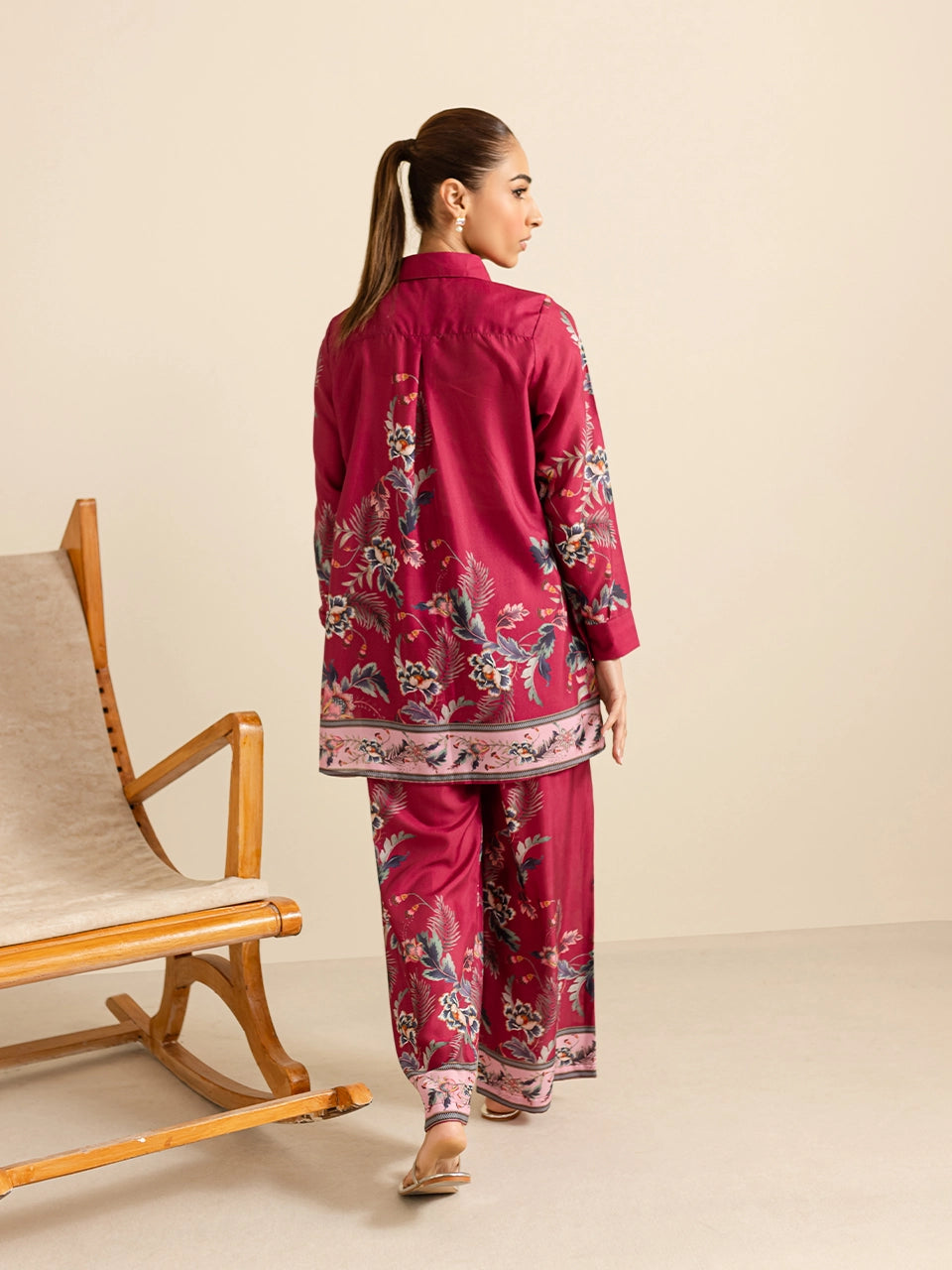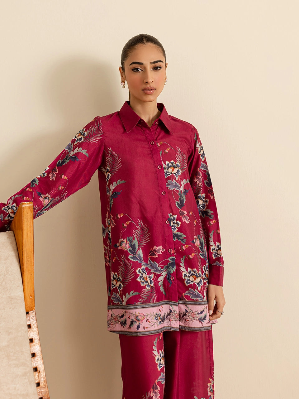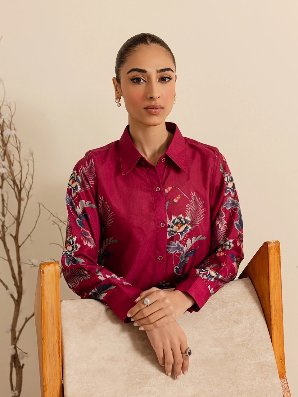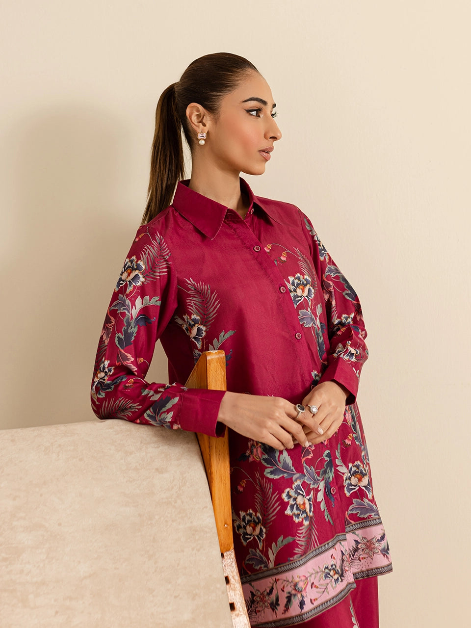 Description: This coord set features a vibrant maroon top with a striking floral print in shades of blue, white, and pink. The design is enhanced with a detailed border at the hemline, blending pink accents with intricate floral patterns for added elegance. Made from a soft, breathable fabric, the shirt is styled with a classic collared neckline, button-down front, and full sleeves, offering both comfort and sophistication. The matching trouser fabric echoes the floral print, completing the coordinated look for a chic and polished ensemble. Perfect for casual outings or semi-formal occasions
