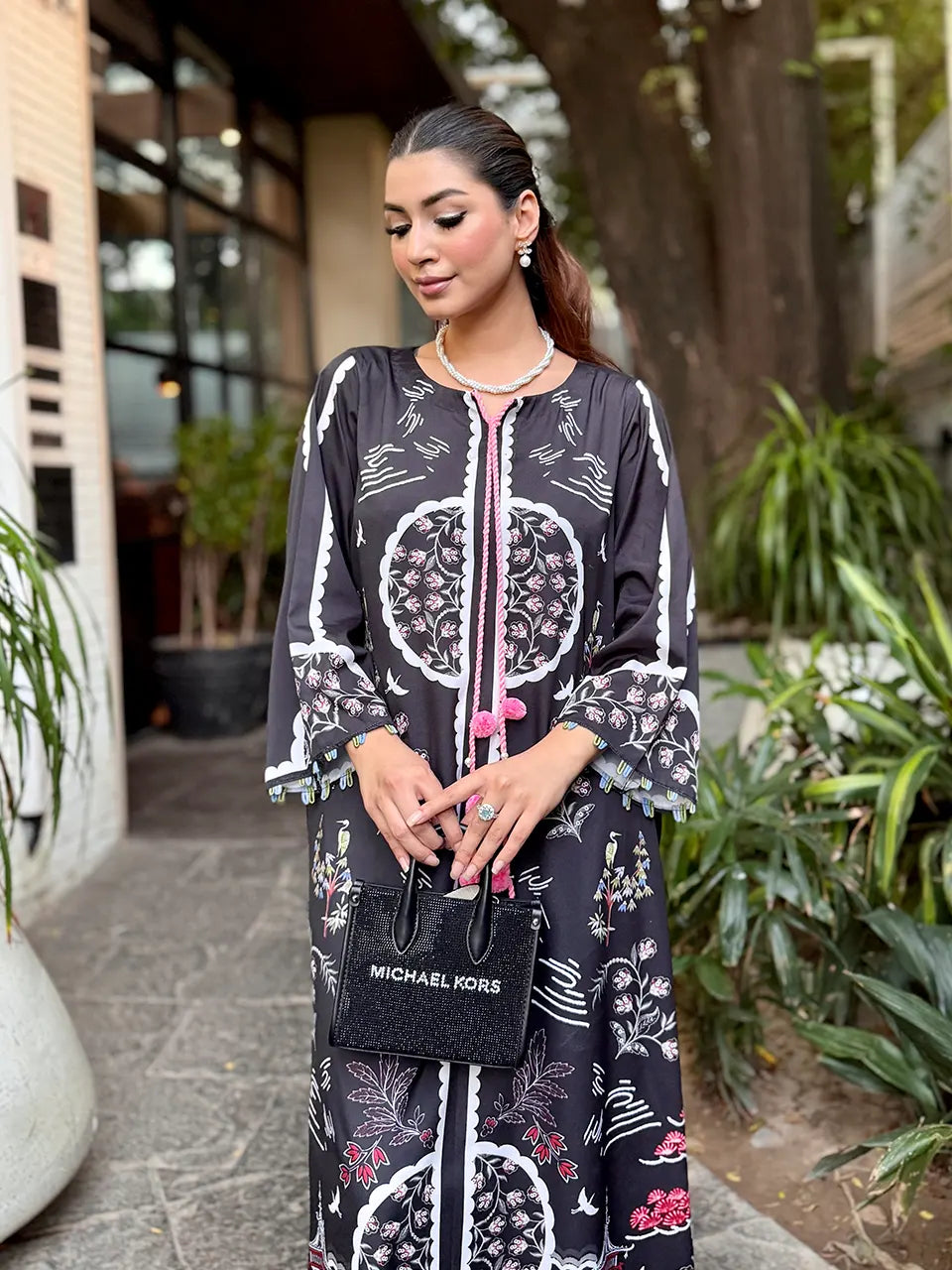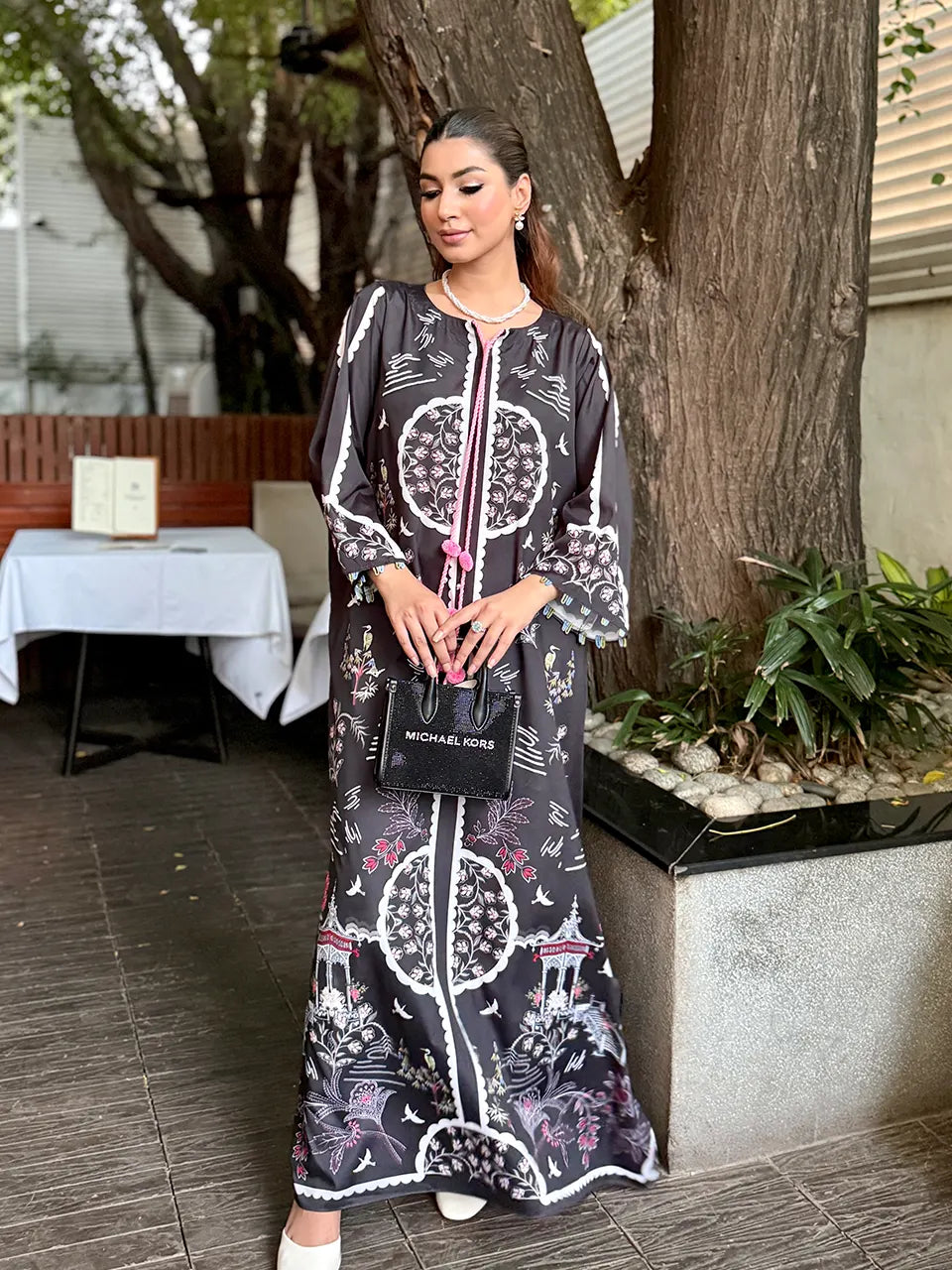 Description: Sophisticated and timeless, this black kaftan features bold geometric patterns and subtle pink accents. Its relaxed silhouette and silky texture make it a modern classic for fall soirées.