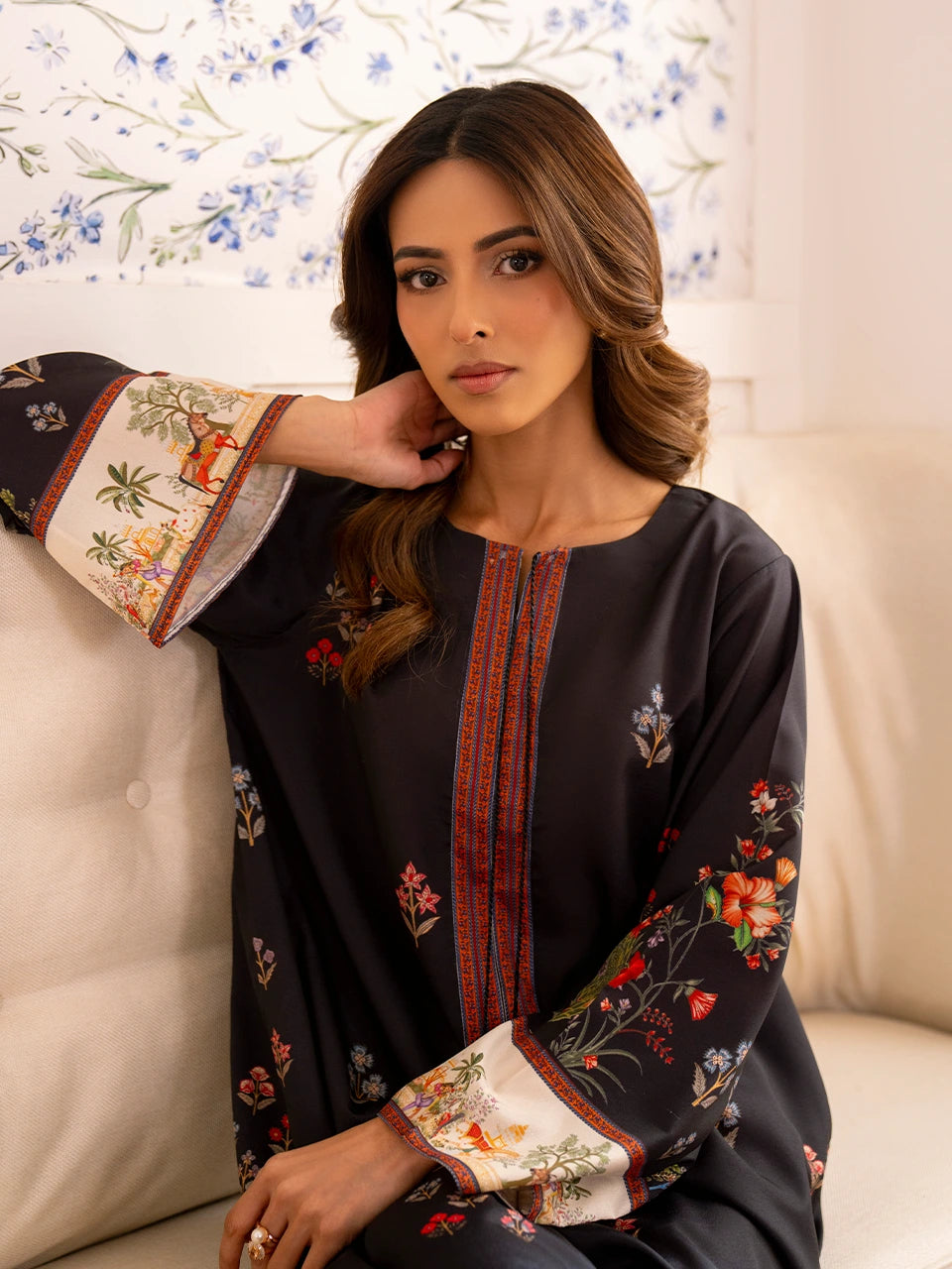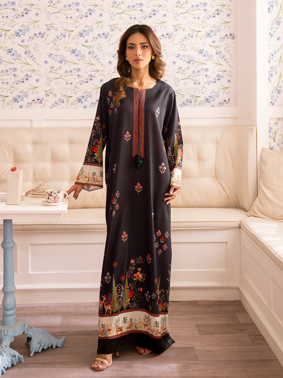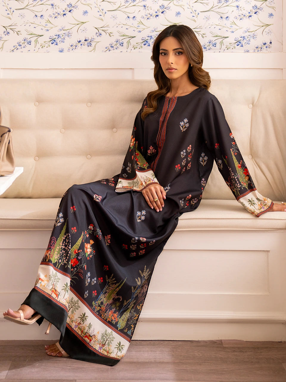 Description: A dramatic black canvas detailed with intricate border motifs inspired by nature—elegant, earthy, and captivating.