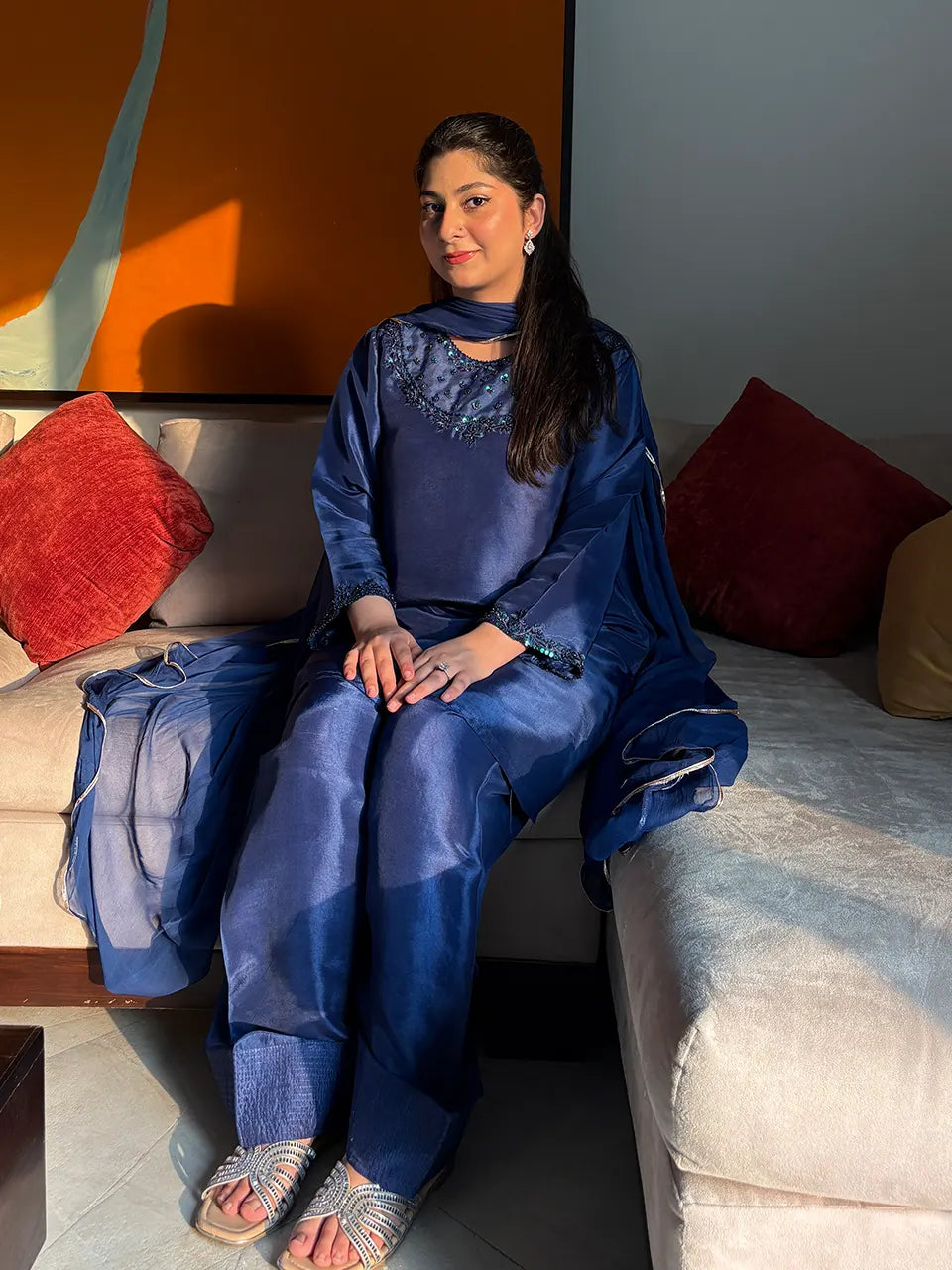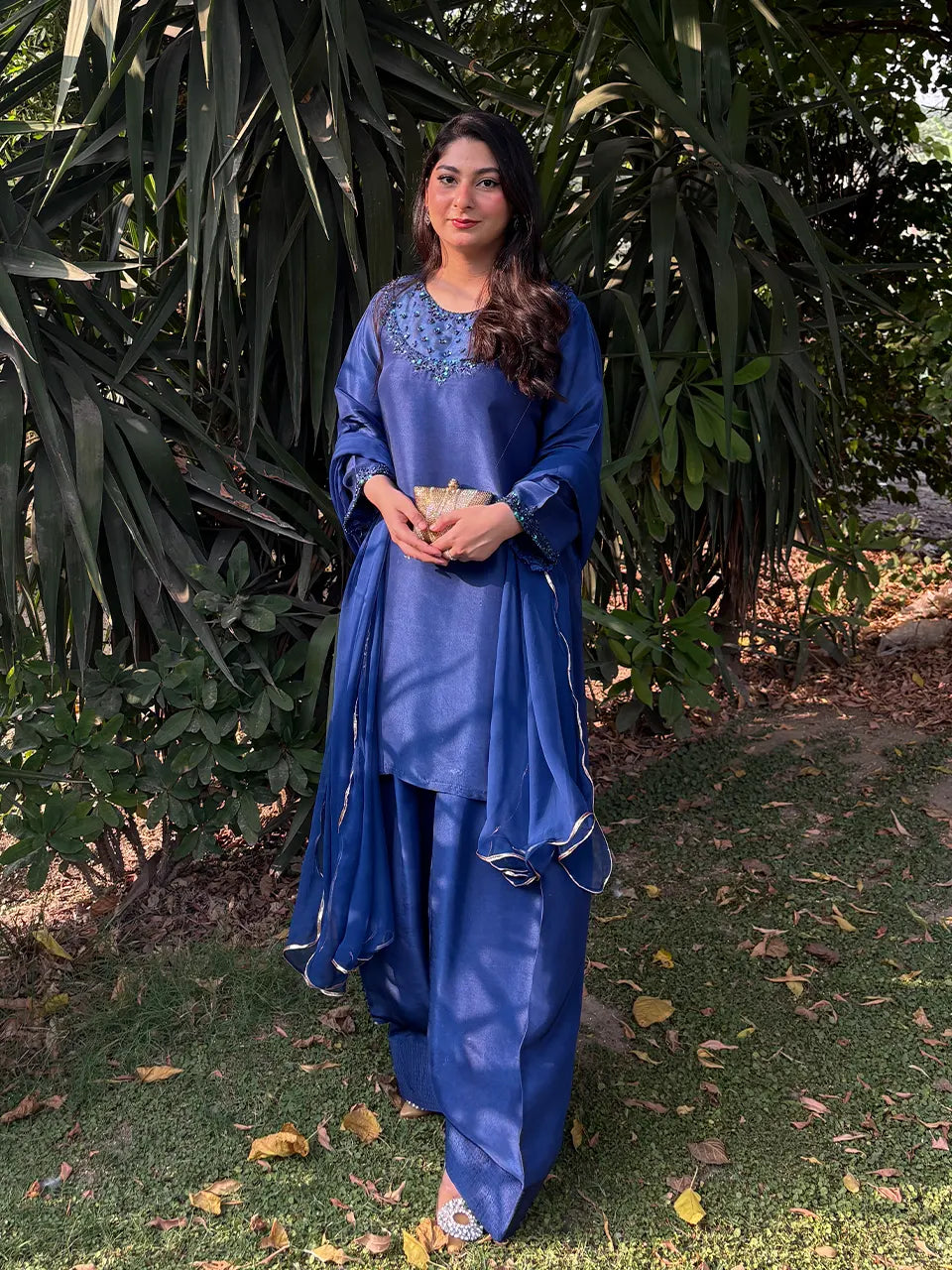 Description: A deep navy blue silk outfit that exudes sophistication. The smooth, lustrous shirt paired with matching shalwar and an elegant dupatta creates a timeless, luxurious silhouette—ideal for evening wear.