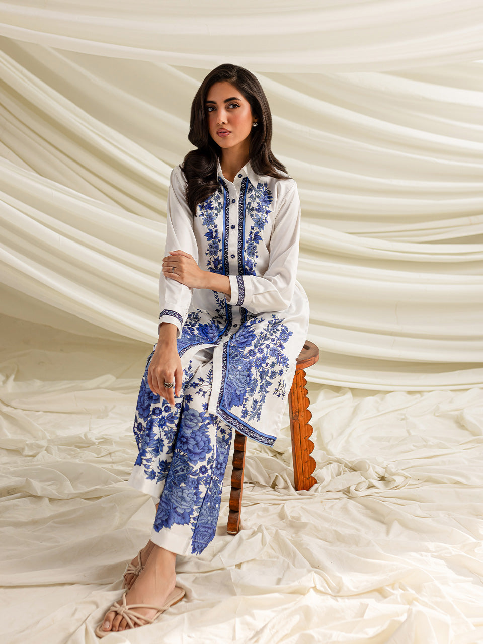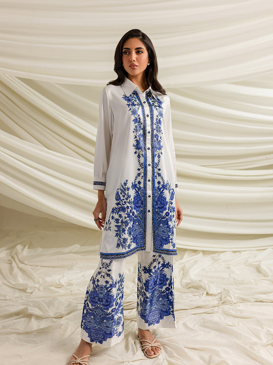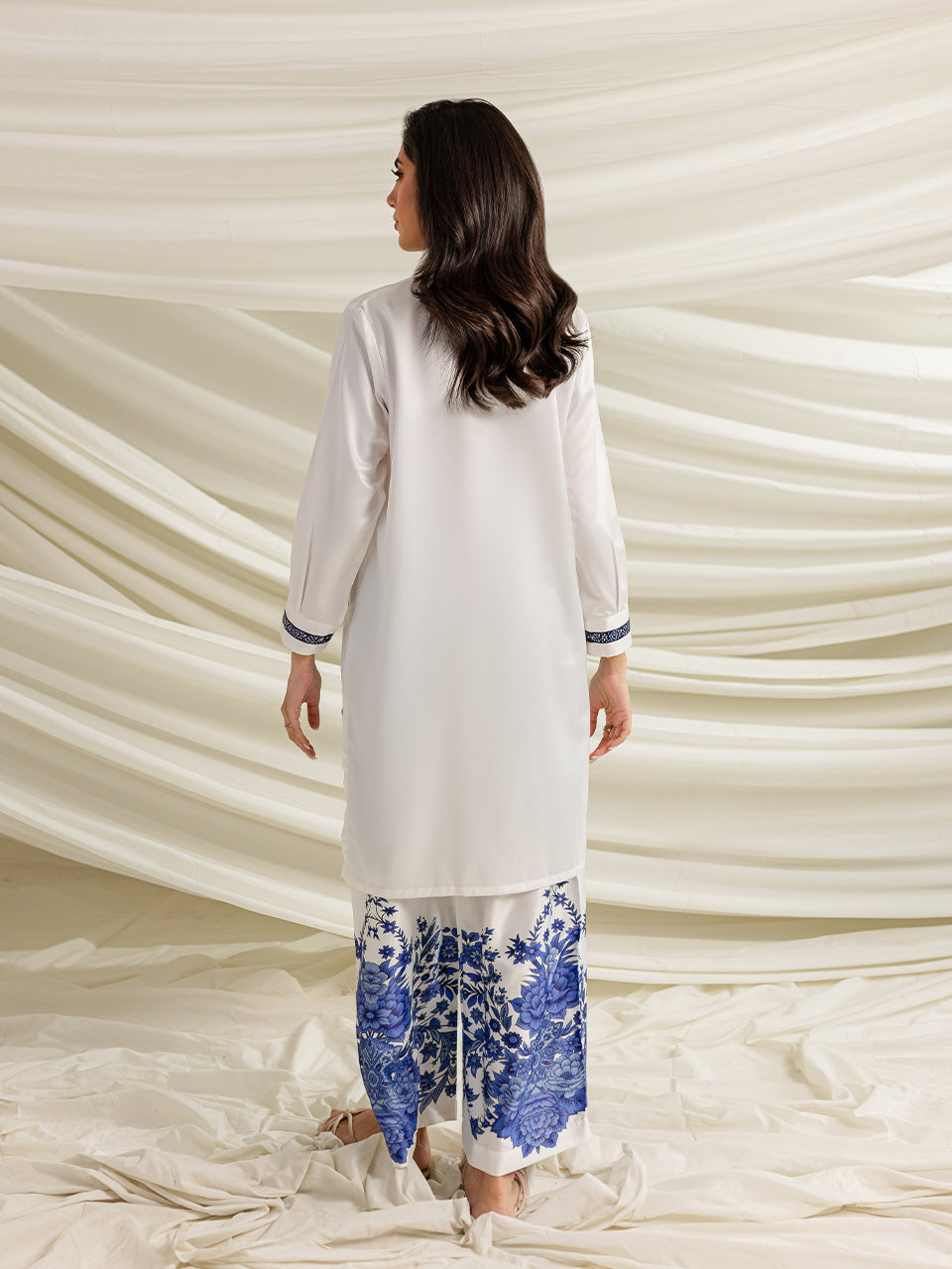 Description: This crisp white silk outfit features an exquisite blue floral print on both the tunic and wide-legged pants. The relaxed fit and elegant color combination make it perfect for daytime events or formal occasions, offering both sophistication and comfort.