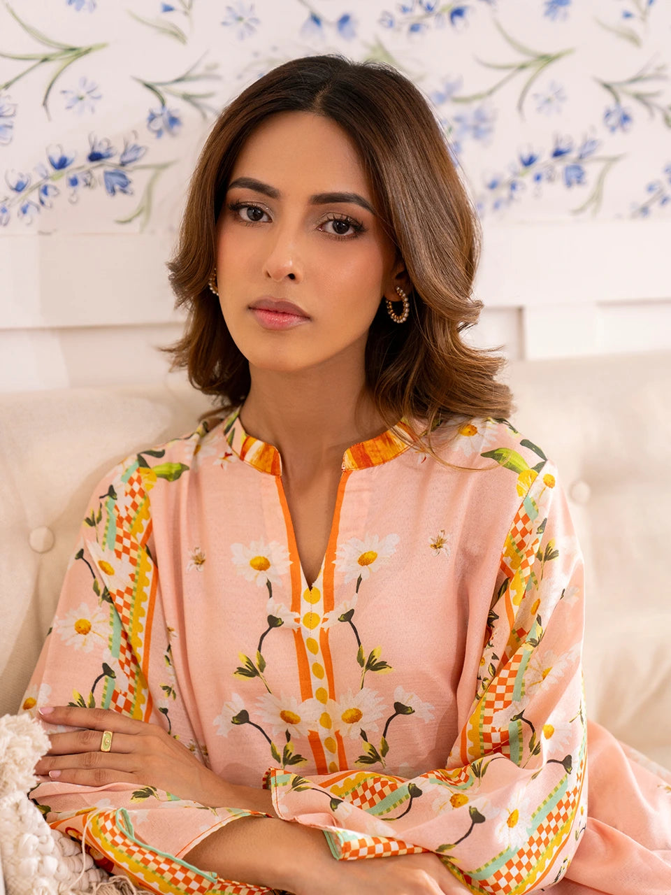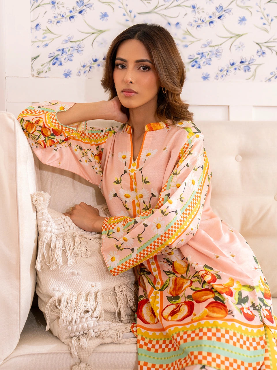 Description: A soft peachy tone with warm marigold and tangerine floral prints; effortlessly bright and playful.