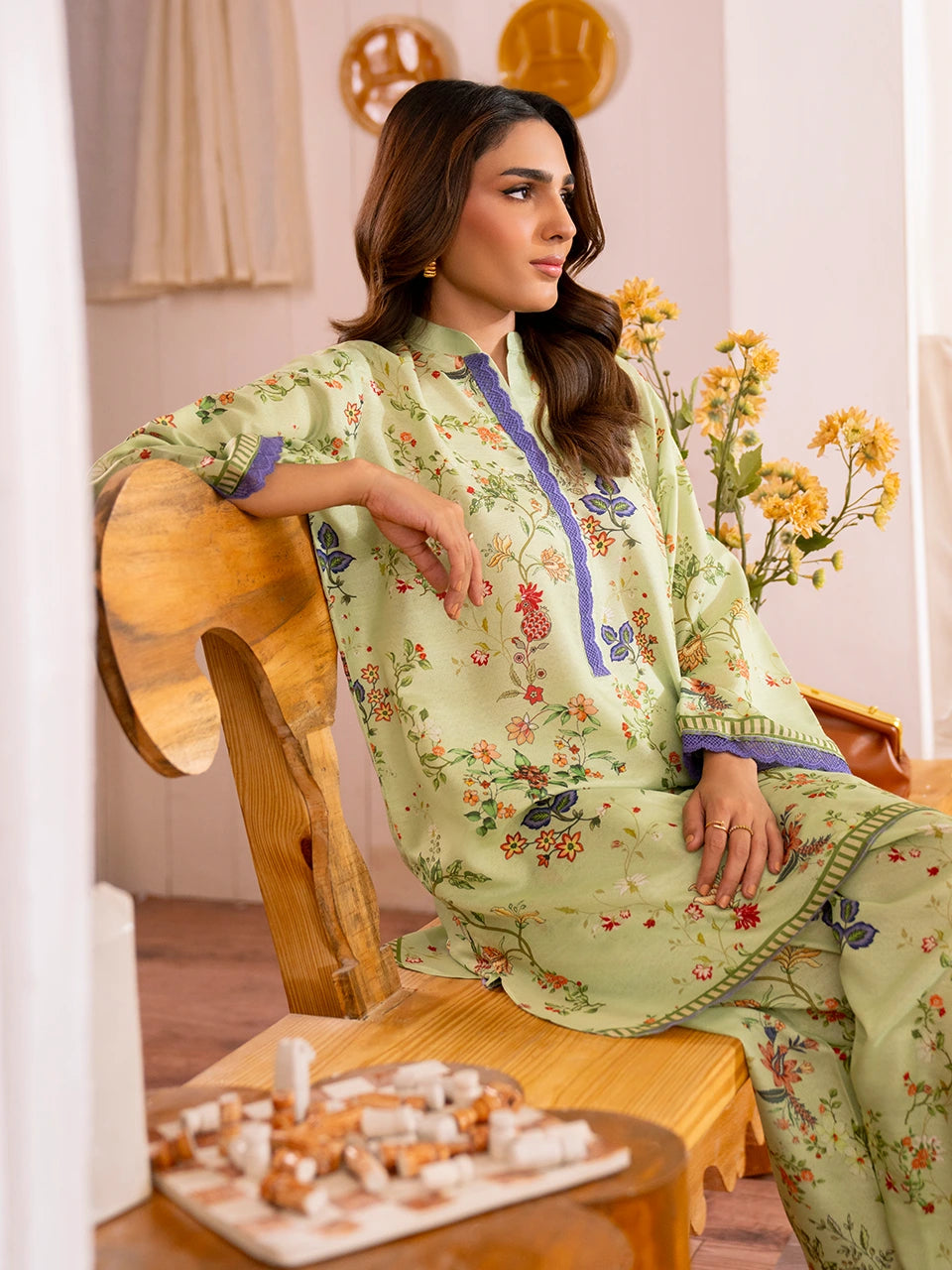 Description: Pistachio green adorned with scattered florals and a purple-trimmed neckline — fresh, youthful, and timeless.