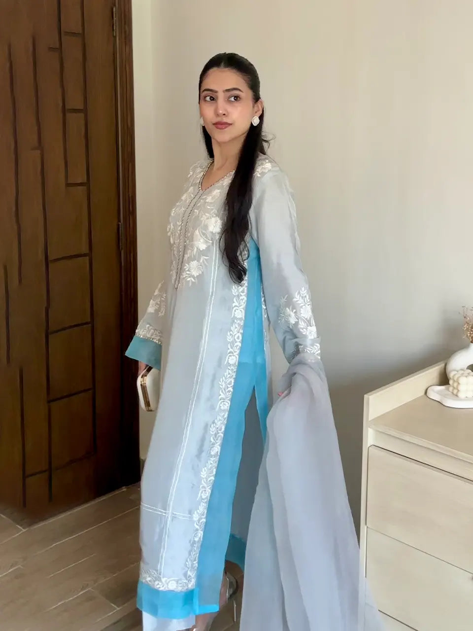 Description: A vibrant yellow outfit designed to radiate warmth. The flowy shirt comes with subtle embroidery and applique work paired with farshi shalwar, complemented by a blocked printed organza dupatta festive grace. A lively look ideal for casual gatherings.