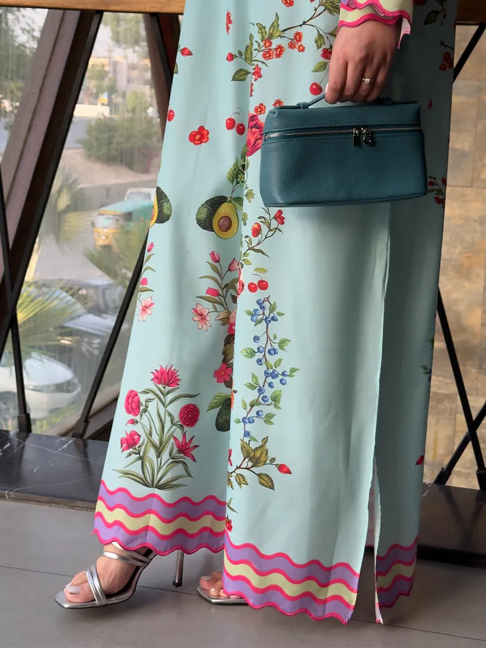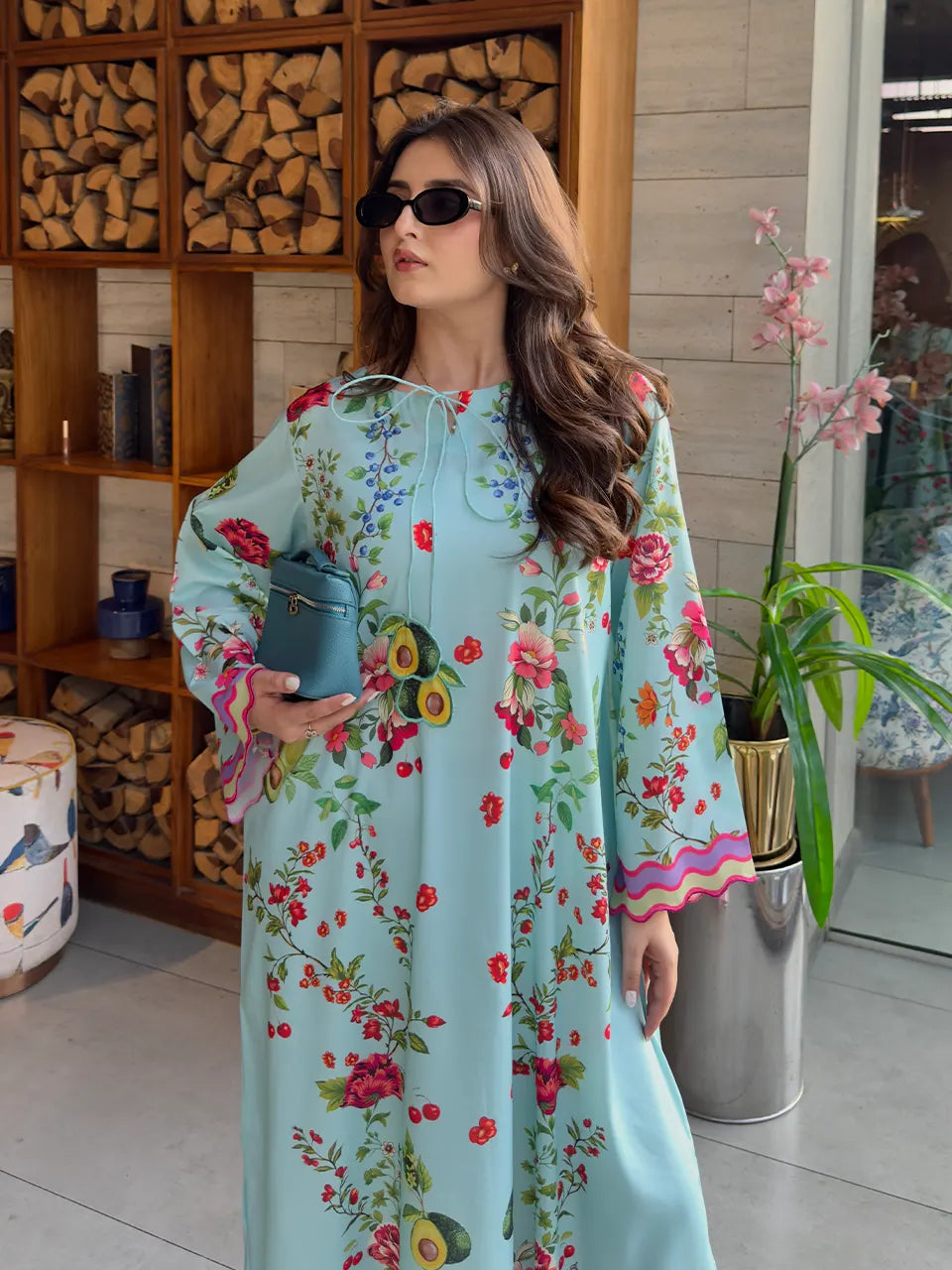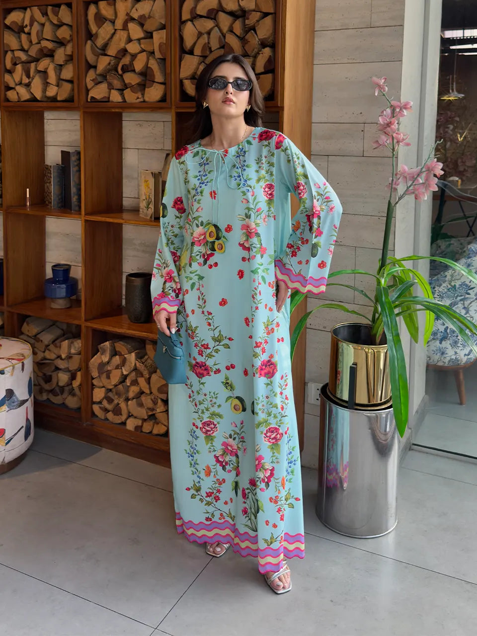Description: A refreshing take on florals, this sky-blue kaftan bursts with vibrant blooms and a hint of whimsy. Light, breezy, and gracefully feminine—ideal for daytime gatherings or resort wear.